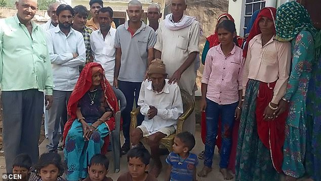 Cụ ông Budh Ram chụp ảnh cùng con cháu sau khi tỉnh dậy giữa đám tang chính mình. Ảnh: CEN