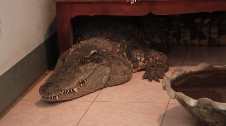 Nathip sống cùng chú cá sấu trưởng thành đã 20 năm qua. Con vật thoải mái đi lại trong nhà và sẽ khiến những vị khách không mời khiếp sợ.