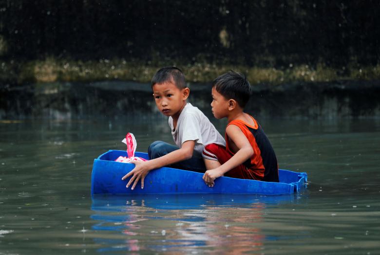 Mặc dù mưa lũ gây ngập lụt diện rộng nhưng những đứa trẻ vẫn hồn nhiên chơi đùa trên những tấm bè, mảnh xốp. Ảnh: Reuters