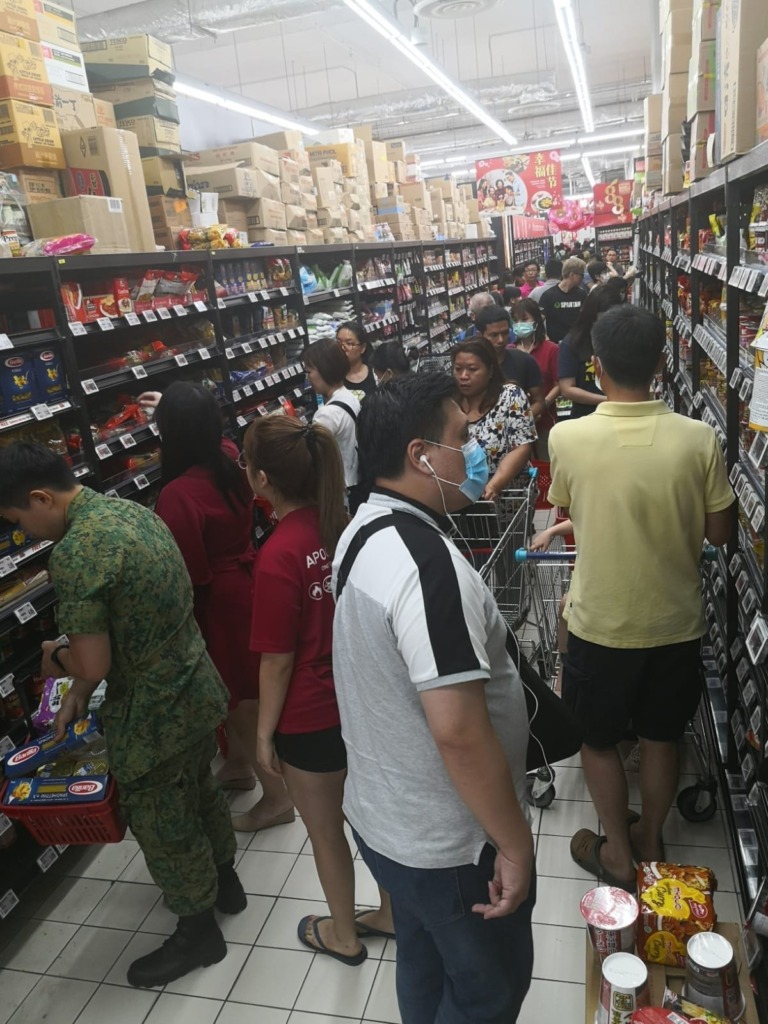 Tối ngày 7/2, truyền thông Singapore liên tiếp đưa tin về cuộc “càn quét” nhu yếu phẩm của người dân để đề phòng tình huống xấu nhất. Các siêu thị lớn nhỏ ở đảo quốc sư tử đều chật ních người, kệ hàng hầu như đều trống rỗng.
