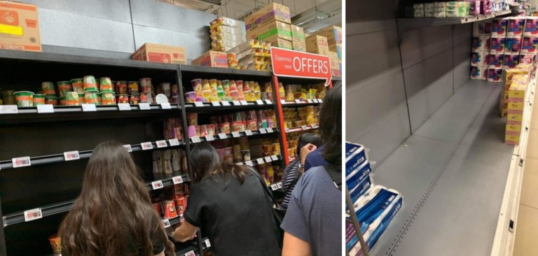 Chỉ trong một ngày ngắn ngủi, gần như tất cả mặt hàng thực phẩm khô và đóng hộp như mì, mì ống, gạo đều hết nhẵn, những sản phẩm thiết yếu như giấy vệ sinh cũng chẳng còn lại gì. Mới 20h20, lượng khách xếp hàng chờ thanh toán đã kéo dài từ quầy thu ngân đến tận khu thực phẩm đông lạnh ở góc cuối cùng của siêu thị.