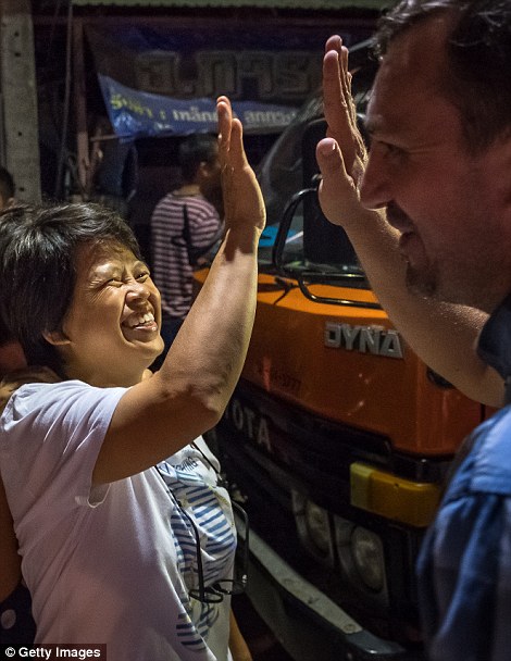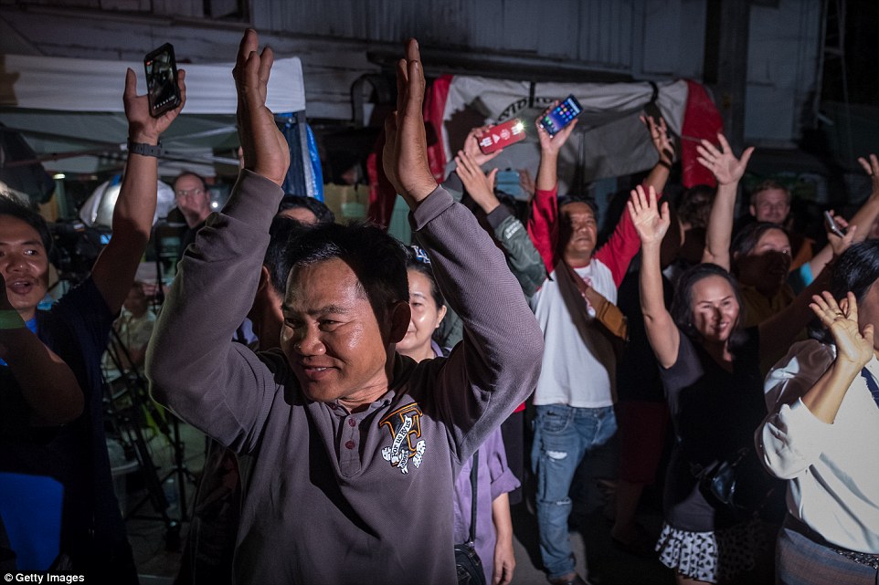 Mọi người nhảy múa vui mừng khi cả 13 thầy trò đều đã được cứu ra ngoài an toàn. Video: Daily Mail
