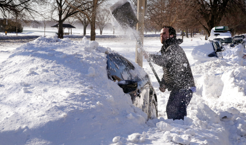 Một người đàn ông đang cố gắng xúc tuyết, “giải cứu” chiếc xe của mình.