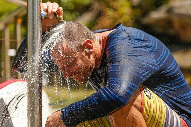 Một người dân xả vòi nước vào đầu tại bãi biển Tamarama ở Sydney, Australia.