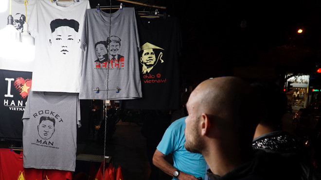 Áo thun in hình Chủ tịch Kim Jong-un và thượng đỉnh Mỹ - Triều tại Hà Nội. Ảnh Đậu Tiến Đạt