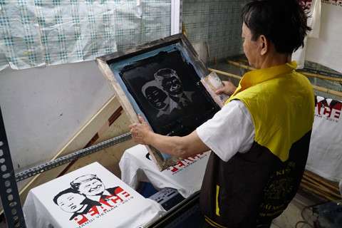 Mẻ in áo thun Tổng thống Trump và Chủ tịch Kim với chữ Peace (Hòa bình) tại Hà Nội. Ảnh Đậu Tiến Đạt
