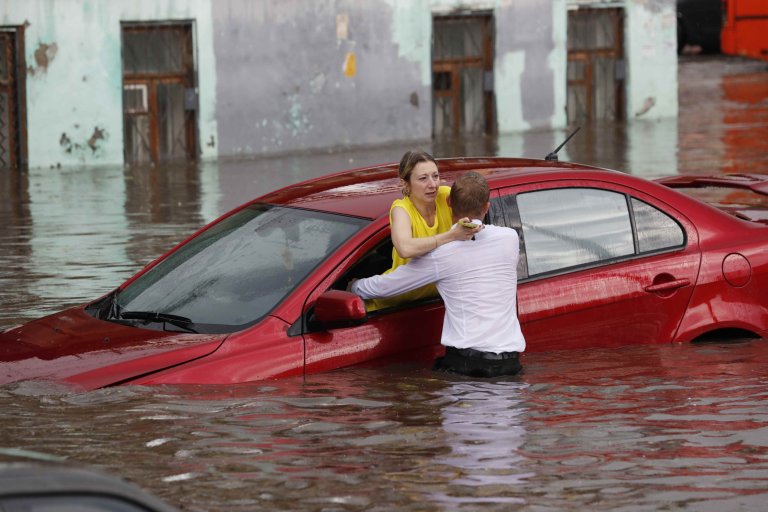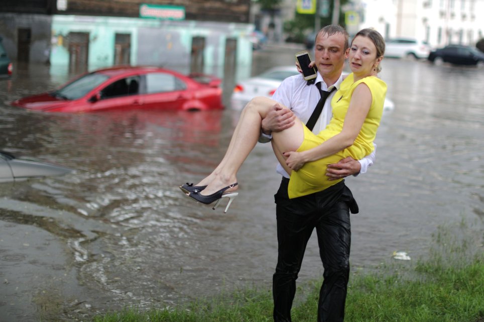 Nước dâng cao còn tràn vào nhiều ô tô di chuyển ở Nizhny Novgorod, khiến các tài xế bị mắc kẹt bên trong xe. Đúng lúc ấy, một nam thanh niên điển trai xuất hiện. Anh không ngần ngại lội dưới dòng nước ngập tới eo để tìm cách đưa một nữ tài xế ra khỏi xe.