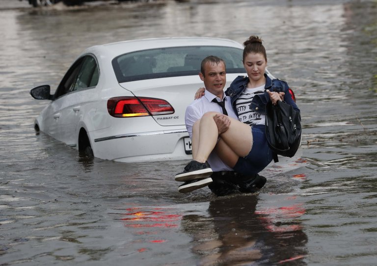 Người phụ nữ được chàng trai đưa lên bờ một cách an toàn. Tình trạng nước ngập đường phố ở Nizhny Novgorod là do hệ thống thoát nước tại đây hoạt động kém.