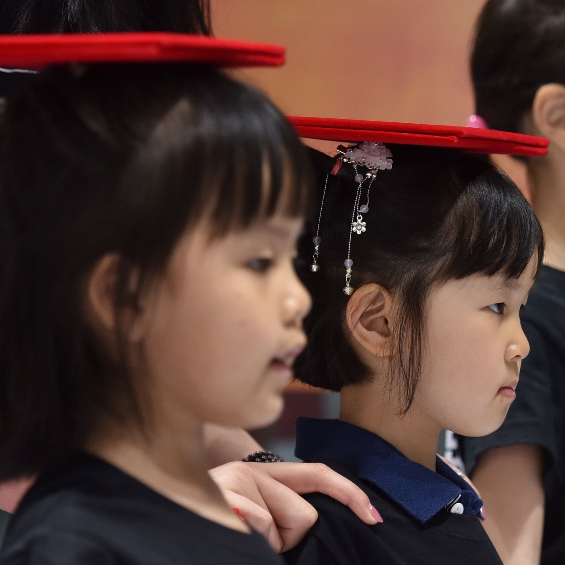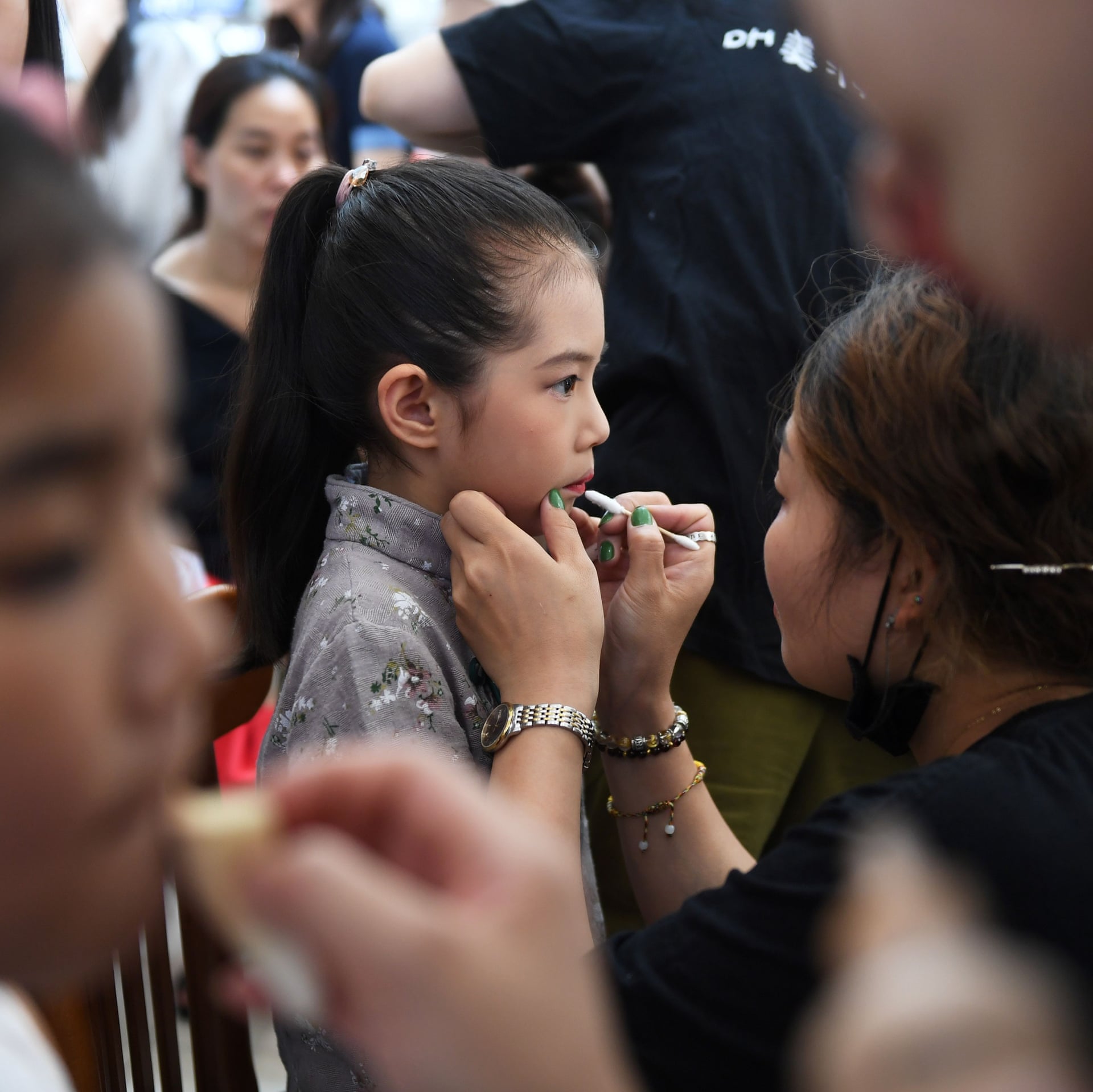 Cặp sinh đôi trai-gái Xiao Yumi và Xiao Yuki đang được cha mẹ trang điểm ở cánh gà.