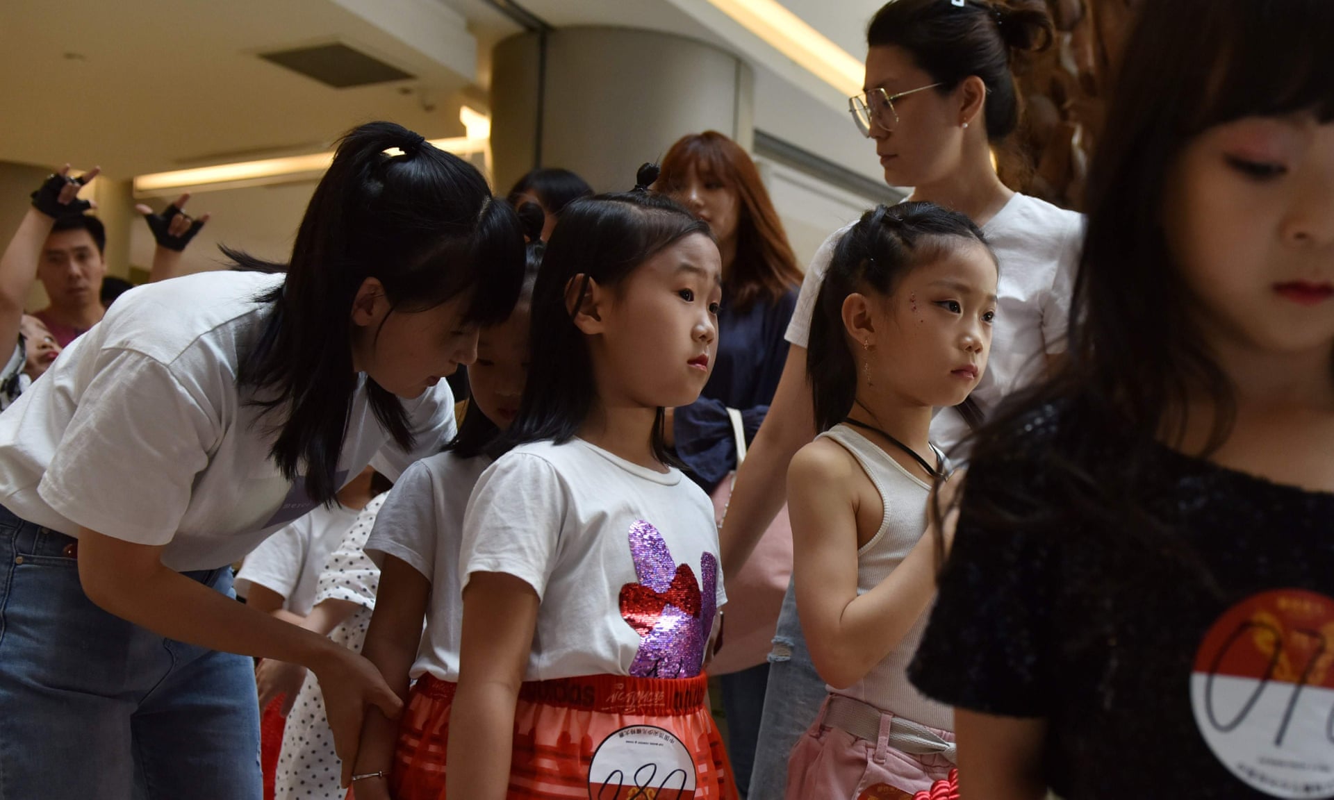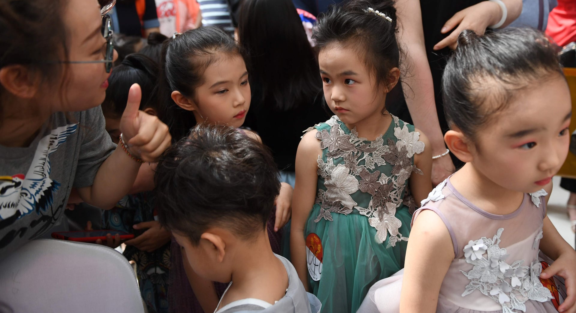 Người mẹ đang động viên con gái mình trước khi em bước lên sàn diễn của một cuộc thi tìm kiếm mẫu nhí.