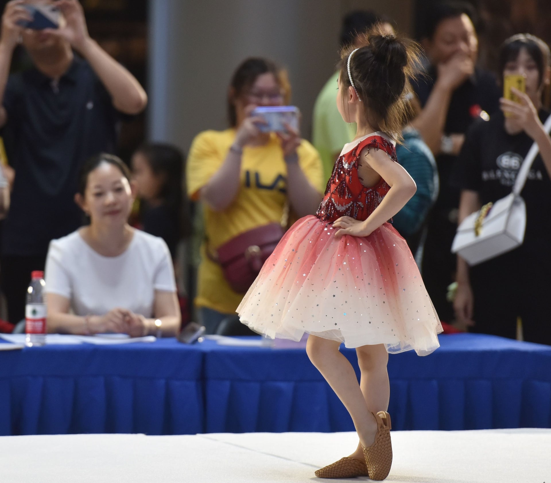 Một bé gái đang tạo dáng trước ban giám khảo trong một show diễn.