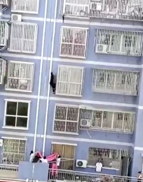 Không màng tới sự an toàn của chính mình, anh Zhang leo tay không lên tầng 5.