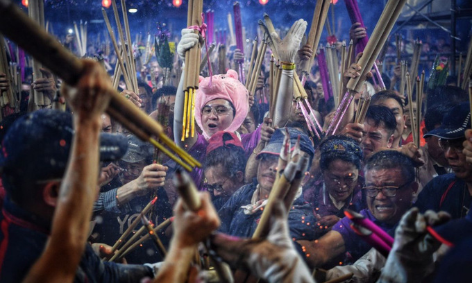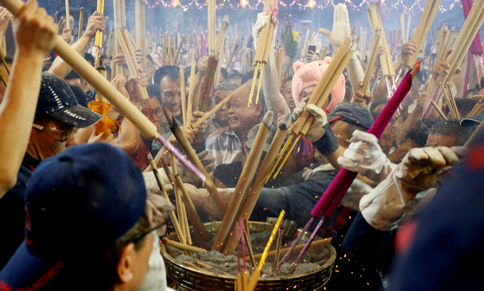 Hàng nghìn người dân Singapore hôm qua đổ tới chùa Kwan Im Thong Hood Cho để thắp hương cầu may mắn trong năm Kỷ Hợi. Một trong các nghi lễ được trông đợi vào đêm giao thừa chính là cuộc chạy đua trở thành người đầu tiên cắm cây hương vào lư hương trong chùa, theo Straits Times.