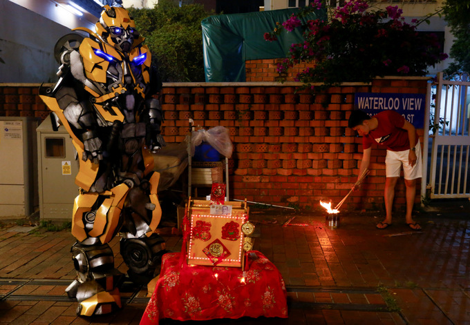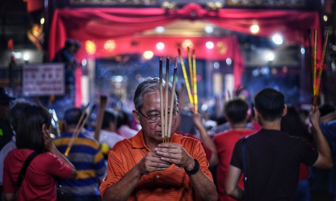 Một người đàn ông đốt hương bên ngoài chùa Kwan Im Thong Hood Cho ở Singapore trong thời khắc giao thừa.