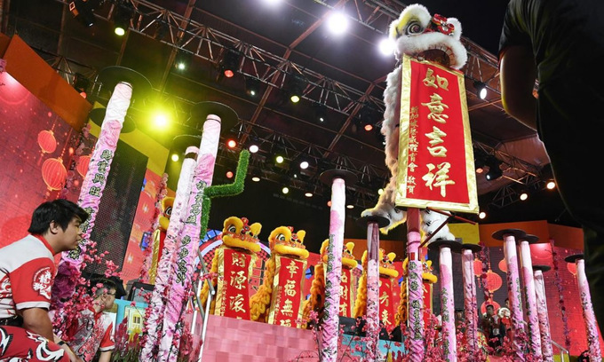 Các nghệ sĩ biểu diễn múa lân tại khu người Hoa ở Singapore.