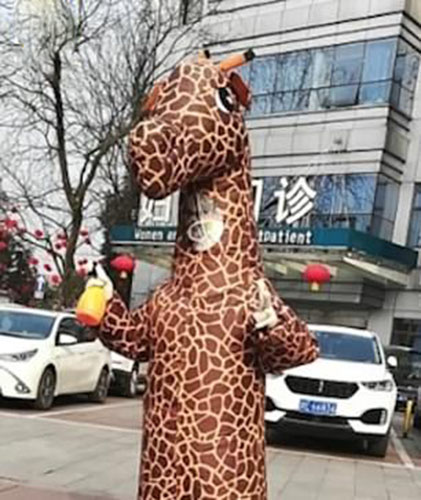 Chủ nhân của ý tưởng độc đáo này là một cô gái họ He ở thị trấn Lô Châu, tỉnh Tứ Xuyên, Trung Quốc, đang chăm sóc bố bị bệnh ở nhà. Tuần trước, sau khi hốt hoảng phát hiện khẩu trang trong nhà đã hết sạch, cô đành mua tạm bộ đồ hóa trang ngộ nghĩnh này để bảo vệ bản thân mỗi lúc ra đường. Ngoài trang phục hươu cao cổ, cô còn mạnh tay mua thêm một bộ hình người ngoài hành tinh để mặc luân phiên.