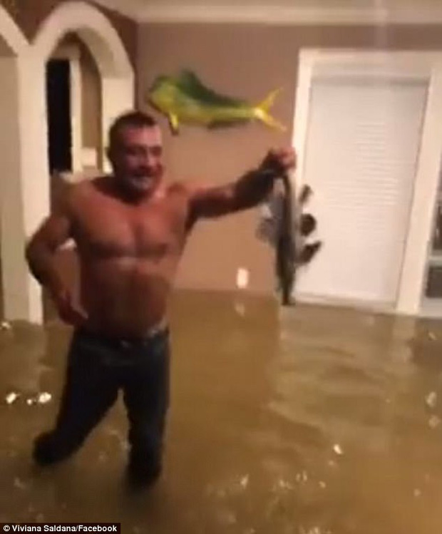 Người đàn ông Mỹ vẫn vui vẻ nô đùa và bắt cá dù dòng nước lũ đã tràn cả vào nhà.