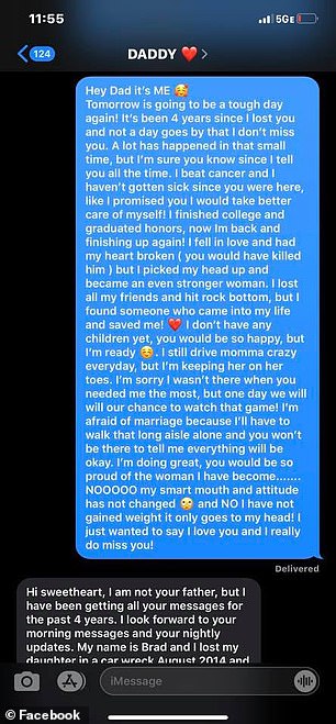“Chào cô bé, chú không phải bố của cháu, nhưng chú đã nhận được tất cả tin nhắn cháu gửi cho ông ấy suốt 4 năm qua. Mỗi sáng thức dậy và đêm trước khi ngủ, chú đều mong tin của cháu. Chú tên là Brad, con gái chú đã mất trong một vụ tai nạn ô tô hồi tháng 8/2014. Chính những dòng tin của cháu đã cứu rỗi đời chú. Lần đầu tiên nhận được tin nhắn của cháu, chú đã biết đây là do Chúa rủ lòng thương xót”, người đàn ông viết.