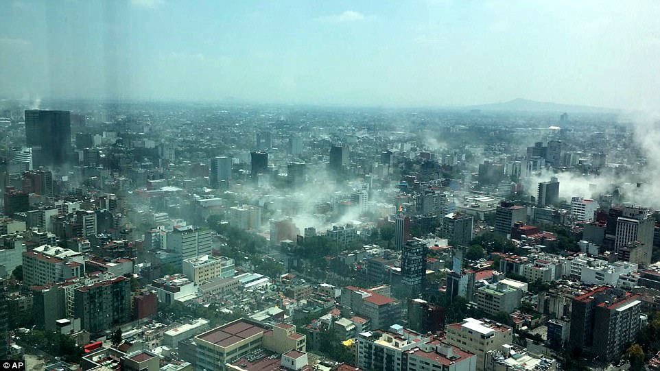 Bụi lan tỏa dày đặc trên thành phố Mexico sau khi một trận động đất mạnh 7,1 độ richter xảy ra tại Raboso, một thị trấn phía nam thủ đô. Ảnh được chụp qua cửa sổ trong tháp Torre Latinoamericana, mang tính biểu tượng ở trung tâm thành phố Mexico.
