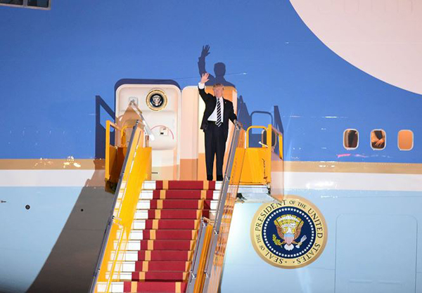 Kết thúc hội nghị APEC tại Đà Nẵng, Tổng thống Donald Trump rời Đà Nẵng tới Hà Nội, bắt đầu chuyến thăm cấp nhà nước Việt Nam theo lời mời của Chủ tịch nước Trần Đại Quang. Đúng 17h23 phút ngày 11/11, chuyên cơ Air Force One hạ cánh xuống sân bay Nội Bài (Hà Nội). (Ảnh: Như Ý/Tiền Phong)