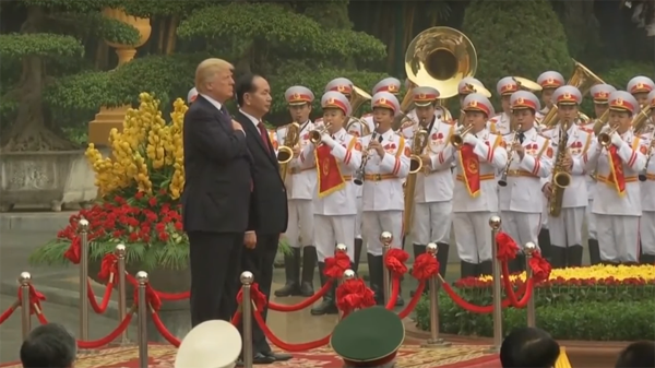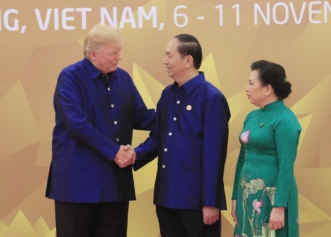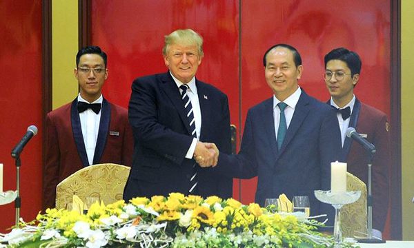 Sáng 12/11, Chủ tịch nước Trần Đại Quang chủ trì lễ đón chính thức Tổng thống Mỹ Donald Trump thăm cấp Nhà nước tới Việt Nam tại Phủ Chủ tịch theo nghi thức dành đón Nguyên thủ quốc gia. Sau lễn đón, hai nhà lãnh đạo hội đàm, chứng kiến lễ ký kết các văn kiện hợp tác song phương và họp báo chung. Trong cuộc họp báo, Tổng thống Trump nói ông rất ấn tượng khi biết Việt Nam đang trở thành thị trường xuất khẩu phát triển nhanh nhất của Mỹ.
