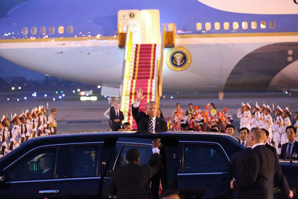 Tổng thống Trump tươi cười, vẫy tay bước xuống thang máy bay. Sau lễ đón tại sân bay, tổng thống lên xe Cadillac di chuyển về trung tâm Hà Nội. (Ảnh: Như Ý/Tiền Phong)