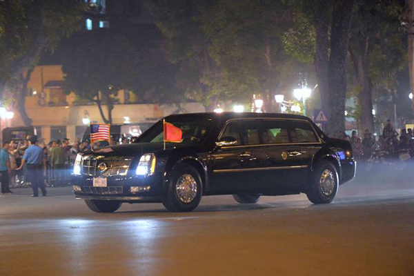 18h15 phút, đoàn xe chở Tổng thống Mỹ Donald Trump về tới khách sạn Metropole, quận Hoàn Kiếm. Ông Trump là vị tổng thống Mỹ đầu tiên tới thăm Việt Nam ngay trong năm đầu nhiệm kỳ. (Ảnh: Công Đạt/ Tiền Phong)