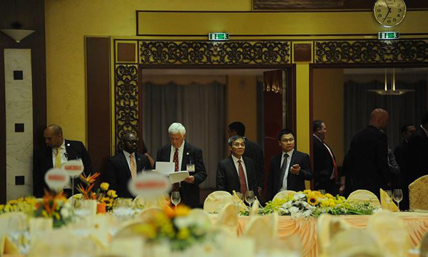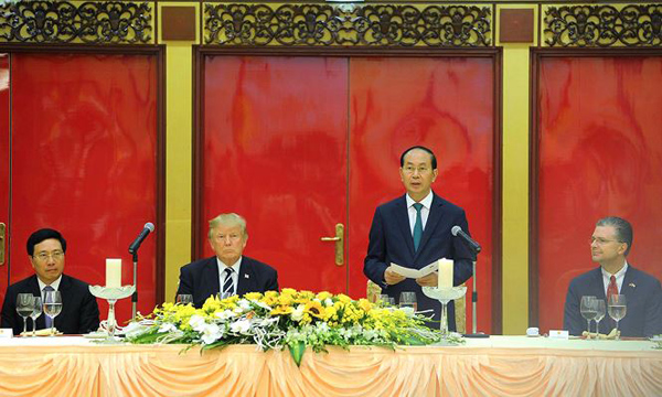 Khoảng 20 giờ cùng ngày, Chủ tịch nước Trần Đại Quang chủ trì buổi tiệc chiêu đãi Tổng thống Donald Trump cùng đoàn đại biểu cấp cao Mỹ tại Trung tâm Hội nghị quốc tế, quận Ba Đình. )(Ảnh: Xuân Tùng/ Tiền Phong)