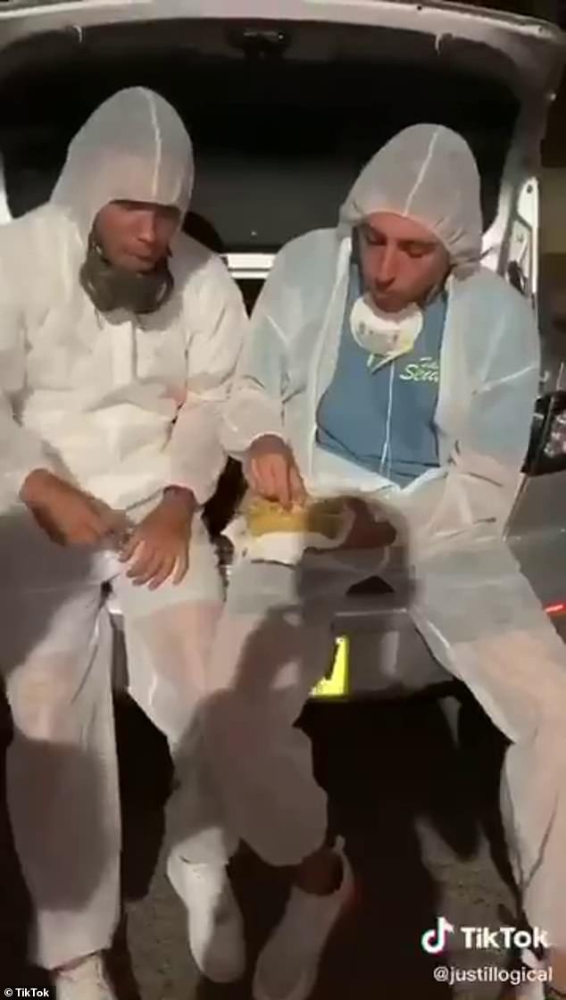 Khi bước vào một nhà hàng Trung Quốc để lấy thức ăn, hai nam thanh niên lại mặc quần áo bảo hộ hazmat (hazardous materials suit) kín từ đầu đến chân.