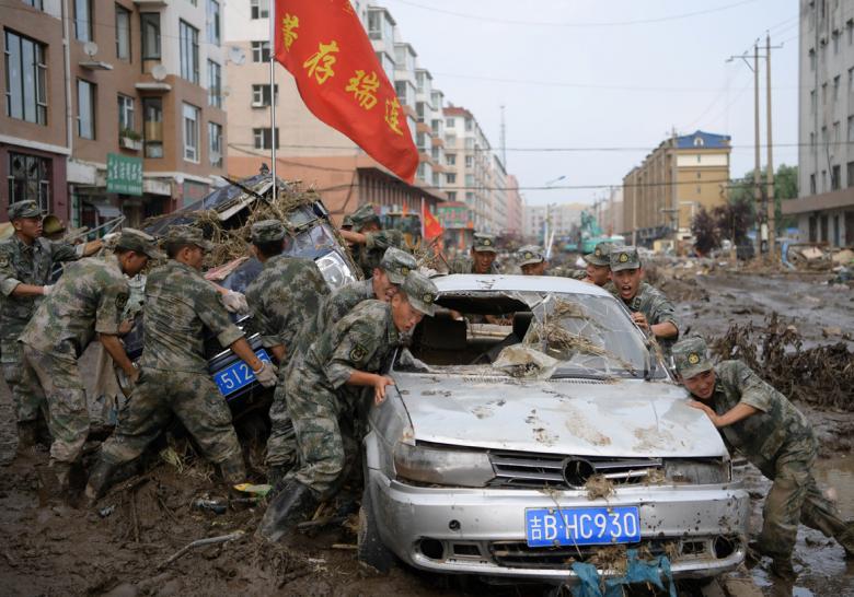Ngày 17/7, đội cứu trợ đang cố gắng kéo những chiếc xe bị hư hỏng nặng ra khỏi bùn đất và các mảnh vỡ sau khi lũ lụt quét qua tỉnh Cát Lâm, Trung Quốc.