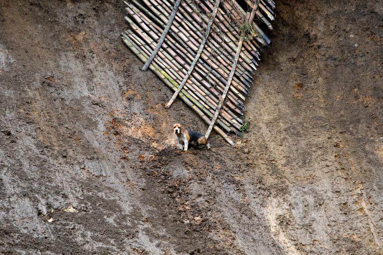 Một chú chó đang chờ đợi trong sợ hãi để được giải cứu tại một khu vực bị phá hủy nghiêm trọng sau khi mưa lớn ở Manizales, Colombia hôm 9/4.