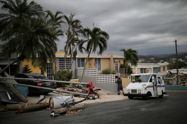 Ngày 6/10, anh Alfredo Martinez, một nhân viên chuyển thư tại San Juan, Puerto Rico, Mỹ vẫn miệt mài làm việc khi cơn bão Maria đi qua.