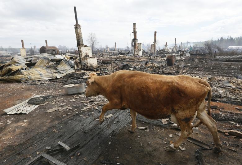 Chú bò đi lại giữa đống đổ nát sau khi trận cháy rừng thiêu sạch khu dân cư Strelka tại Krasnoyarsk, Nga vào ngày 25/5.