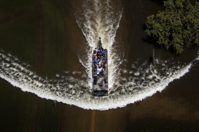 Ngày 31/8, một chiếc tàu quân sự chở khoảng 20 người dân từ căn hộ Autumn Chase Park, Port Arthur, Texas, Mỹ ra khỏi vùng ngập lụt do bão Harvey gây ra.