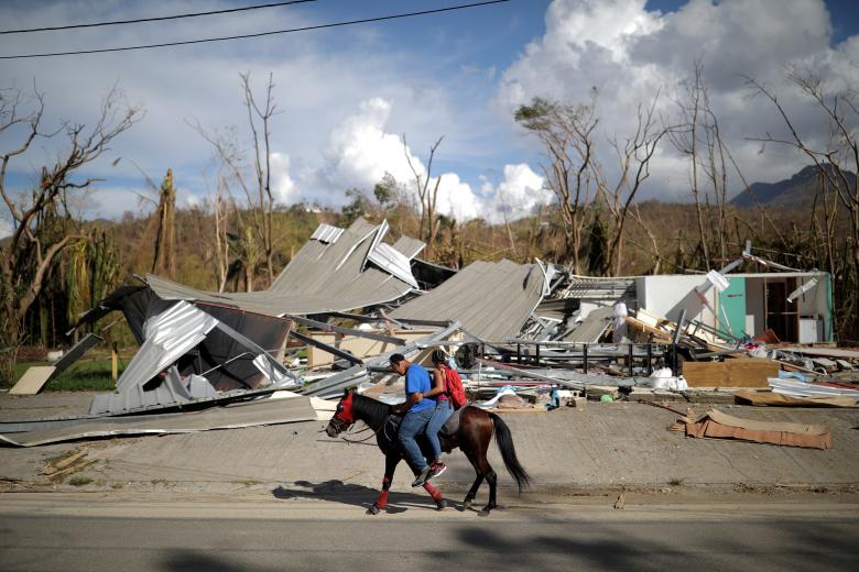 Người dân địa phương ở Jayuya, Puerto Rico, Mỹ cưỡi ngựa băng qua những ngôi nhà bị phá hủy nặng nề do bão Maria gây ra ngày 4/10.