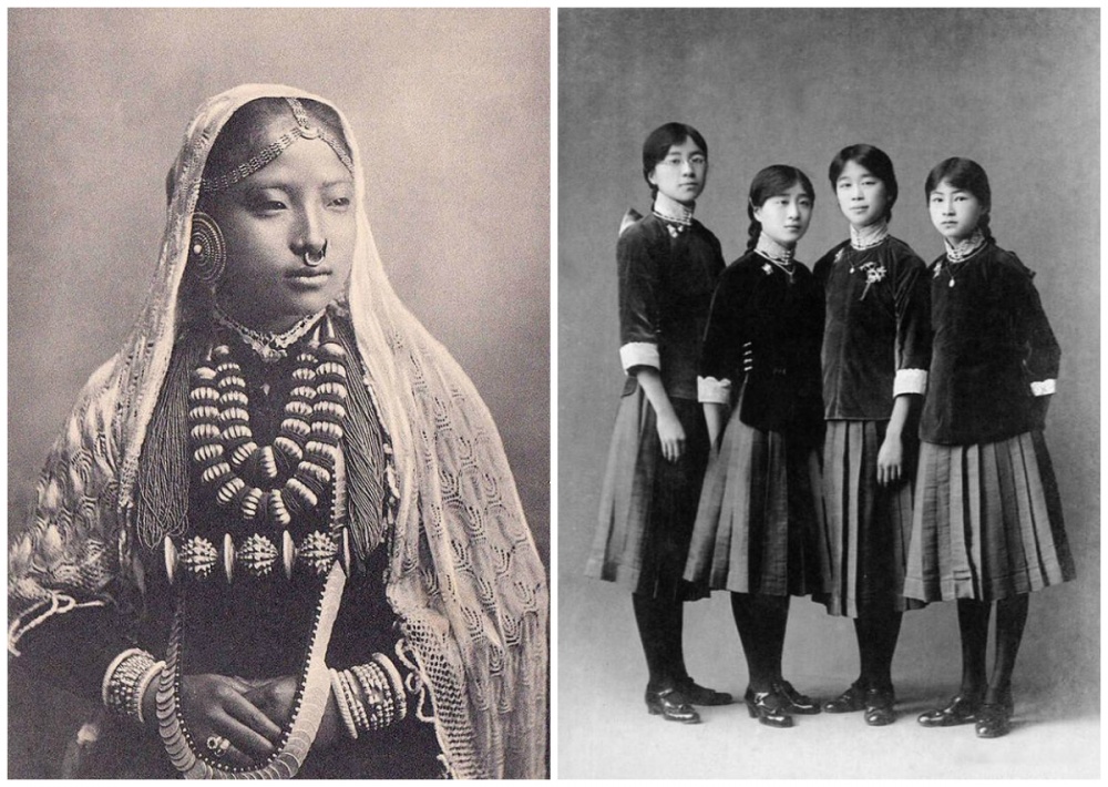 Nhật Bản nổi tiếng với các Geisha. Bên trái là các bé gái Maiko (sau này sẽ trở thành các Geisha) thư giãn trên ban công. Ảnh phải là các nữ sinh ở trường học thuộc thành phố Fukuoka.