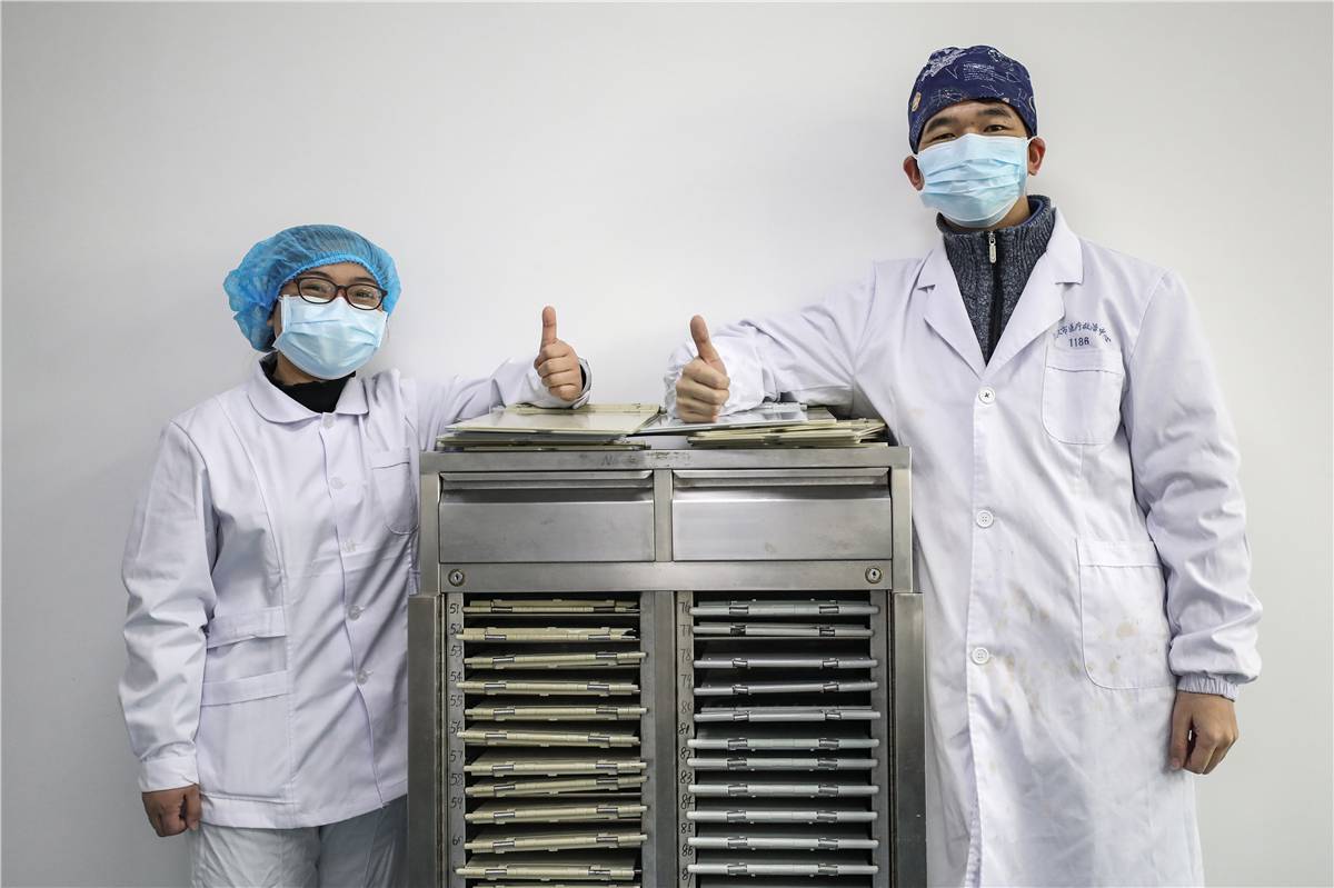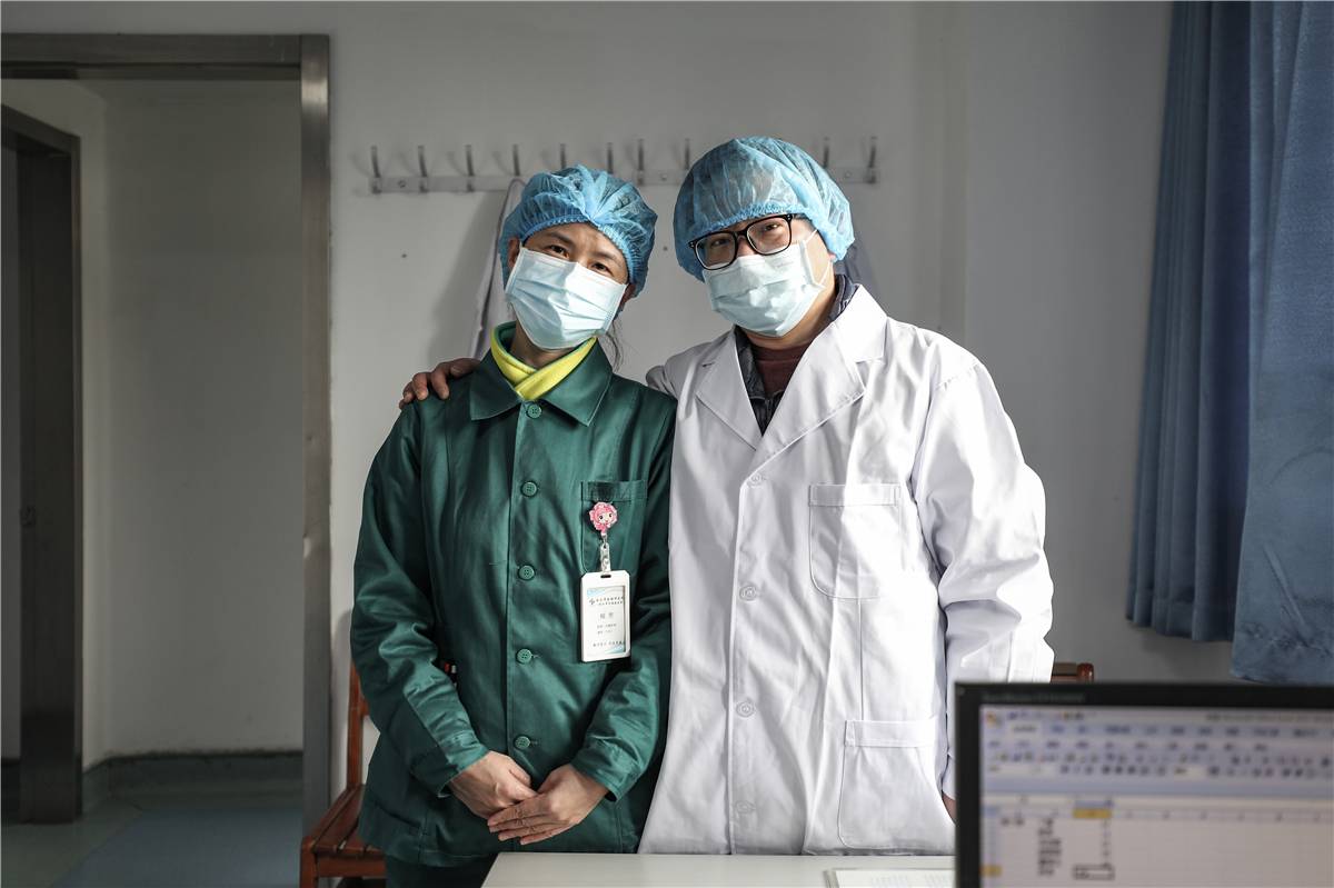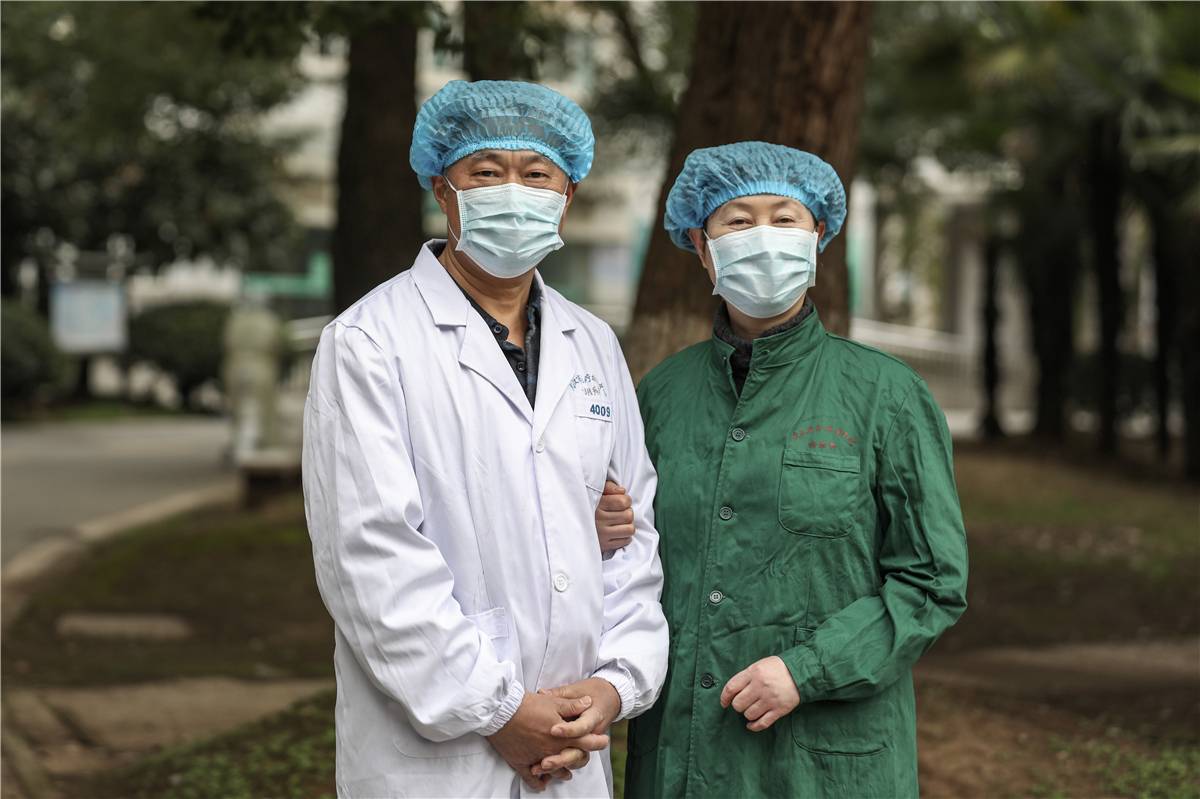 Bác sĩ Tu Chao và vợ là y tá Cheng Fang cùng chung khung hình tại Bệnh viện Kim Ngân Đàm, ngày 13/2. Tu là bác sĩ trực thuộc phòng ICU, còn Cheng đảm nhiệm chức y tá trưởng. Cặp đôi đã nên duyên vợ chồng gần 20 năm.