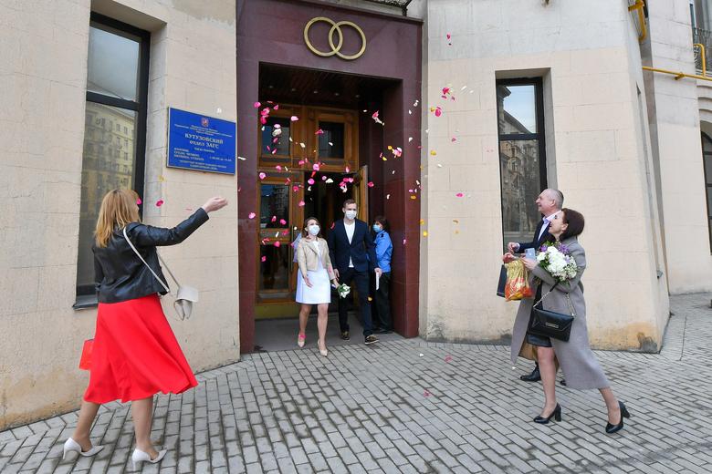 Bạn bè của một cặp đôi tung hoa chúc mừng họ bên ngoài nơi đăng ký kết hôn ở Moscow, Nga ngày 8/4.