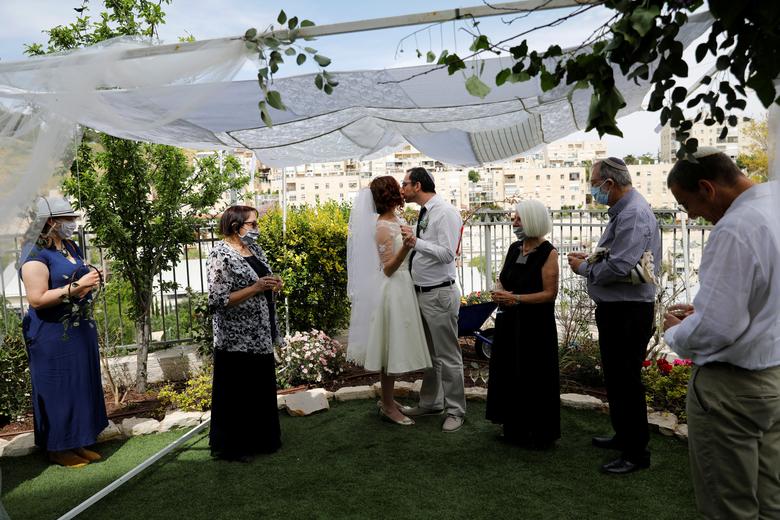 Cô dâu Osnat Baron và chú rể Yaniv Jenger hôn nhau trong lễ cưới của họ với một số lượng khách hạn chế trong vườn nhà ở Jerusalem ngày 27/4.