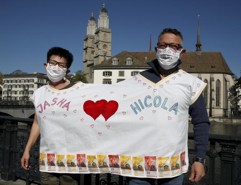 Jasna và Nicola Boccella đeo khẩu trang khi họ chụp ảnh sau lễ cưới trước nhà thờ Grossmuenster ở Zurich, Thụy Sĩ, ngày 14/4.