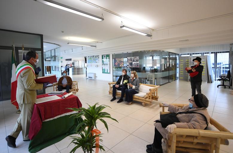 Stefania và Carlo đeo khẩu trang trong lễ cưới chỉ có vài người là nhân chứng tại Castiglione della Pescaia, Italy ngày 22/4.
