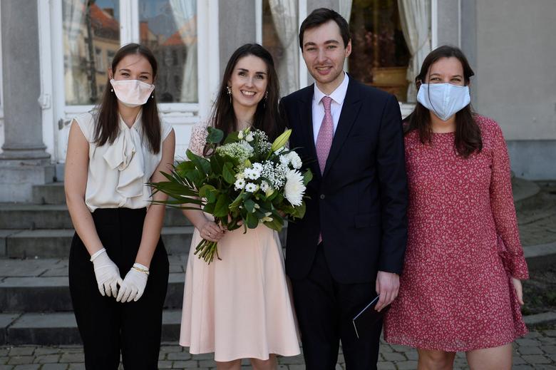 Roxanne, 25 tuổi, một luật sư người Pháp làm việc tại Bỉ và Nicolas, 28 tuổi, một nhân viên bất động sản, chụp ảnh sau lễ cưới ở Brussels, Bỉ, ngày 11/4. Chỉ có vài người làm chứng được phép tham dự buổi lễ.