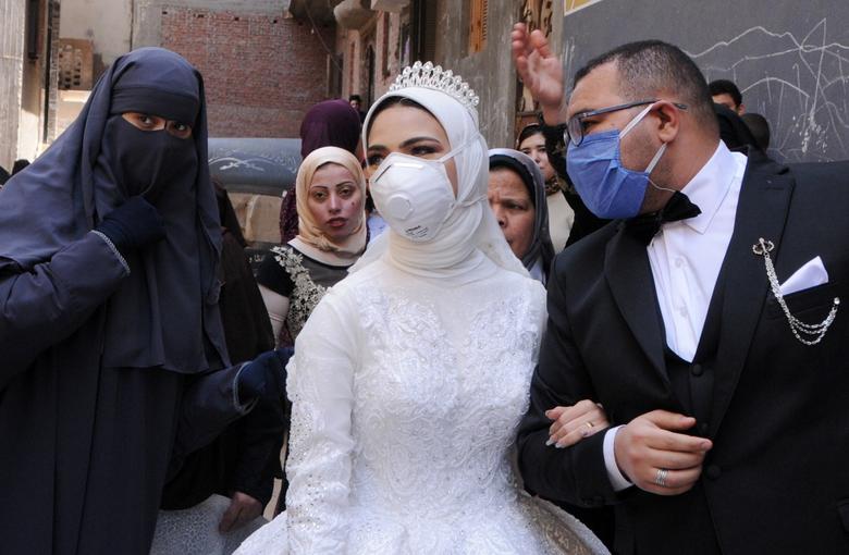 Cô dâu Noha Hamid và chú rể Mustafa Amin đeo khẩu trang trong lễ cưới của họ ở Qalyub, phía bắc Cairo, Ai Cập ngày 16/4.