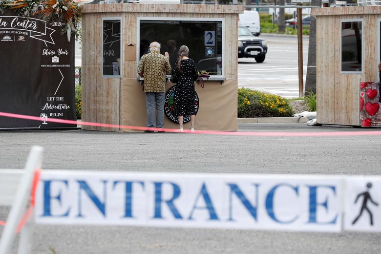 David Isaak và Pamala Blake nói lời thề nguyện thành vợ chồng qua bộ đàm tại một bãi đậu xe ở Anaheim, California, (Mỹ) ngày 17/4. Mỹ, vùng dịch lớn nhất thế giới, ghi nhận hơn 1 triệu ca nhiễm COVID-19, gần 60.000 ca tử vong.