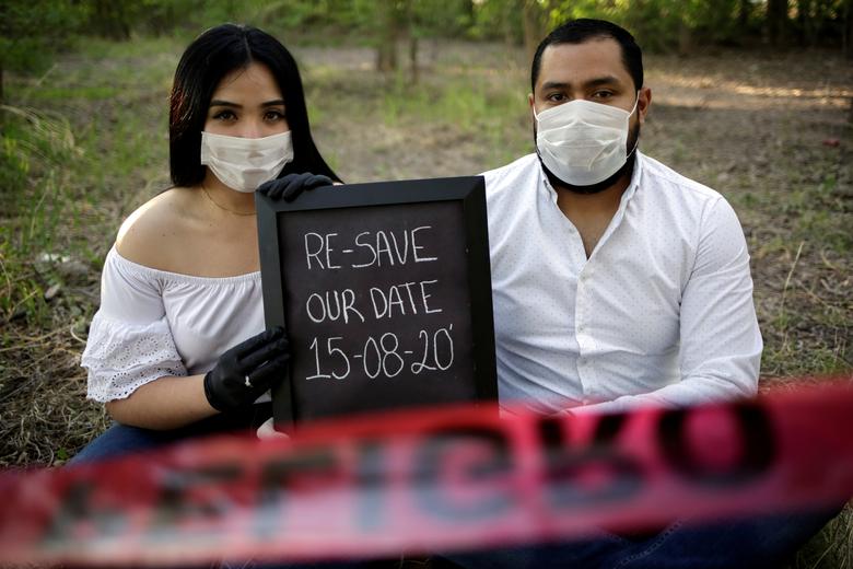 Cặp vợ chồng người Mexico, Gabriela Delgado và Eduardo Toduez đeo khẩu trang trong một buổi chụp hình, cùng giơ tấm bảng thông báo đám cưới của họ sẽ hoãn tới 15/8.