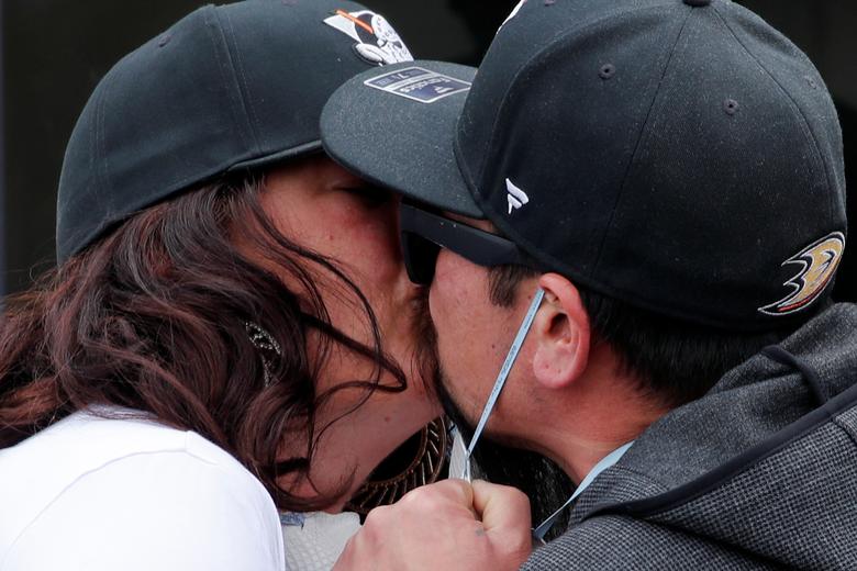 Lynsey Koopman và Jayson Furusawa hôn nhau sau khi nói lời thề nguyện thành vợ chồng ở Anaheim, California (Mỹ) ngày 17/4.