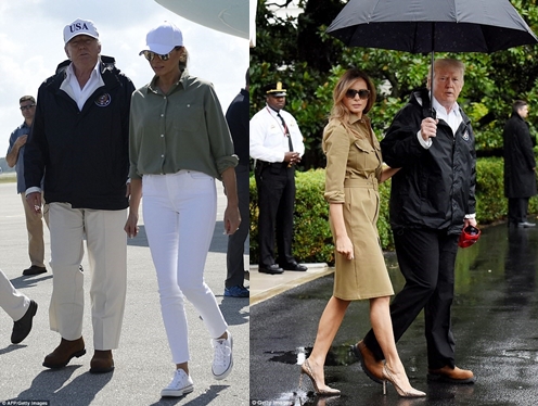 Tháng trước, Đệ nhất Phu nhân Mỹ đã gây ồn ào khi đi một đôi giày cao gót đen đến thăm các khu vực bị bão Hurvey tàn phá. Ở chuyến thăm lần thứ hai, bà vẫn tiếp tục đi một đôi dày cao gót da rắn hiệu Manolo Blahnik trị giá 650 USD.
