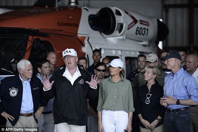 Melania đứng bên cạnh chồng bà khi tổng thống đang nói chuyện với Thống đốc bang Florida trong một cuộc họp báo về cơn bão Irma ngay tại sân bay.