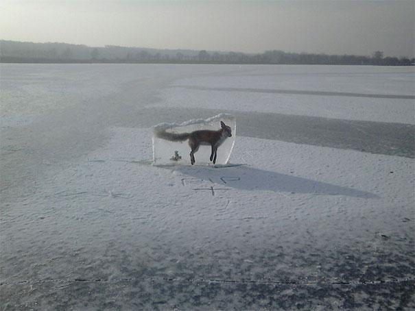 Đây là hình ảnh một con cáo bị rơi xuống hồ và đóng băng. Người dân đưa nó lên và đặt ở nơi nó rơi xuống để cảnh báo mọi người tránh xa khu vực nguy hiểm đó.