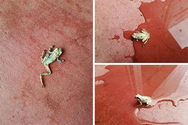 Chú ếch này dường như đã chết khô, nằm chơ vơ trên mặt đất nhưng khi gặp nước nó đã hồi sinh một cách lạ kỳ.